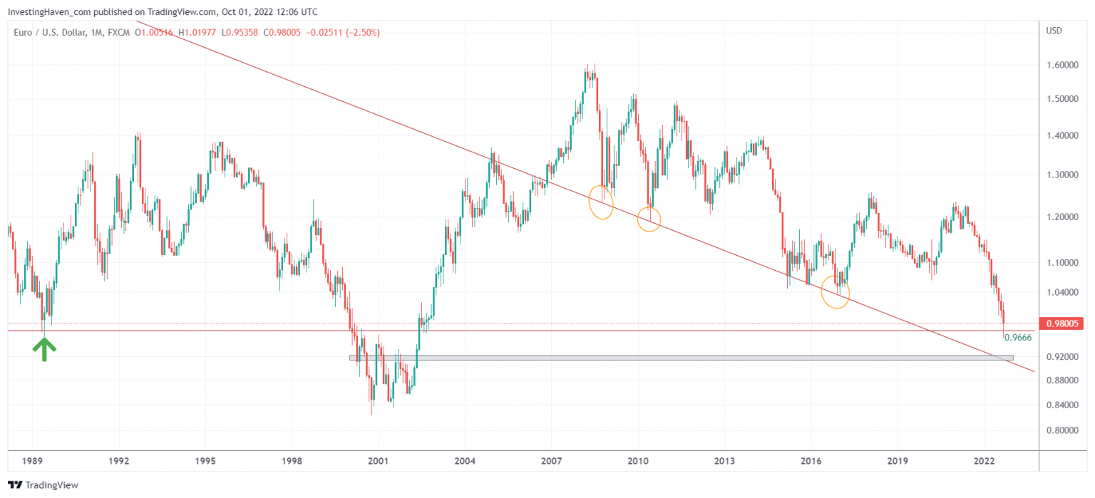 Cena od 0,9666 je dostignuta u septembru 2022. Ovo je važna cena jer je ista najniža cena zabeležena 1989. godine.