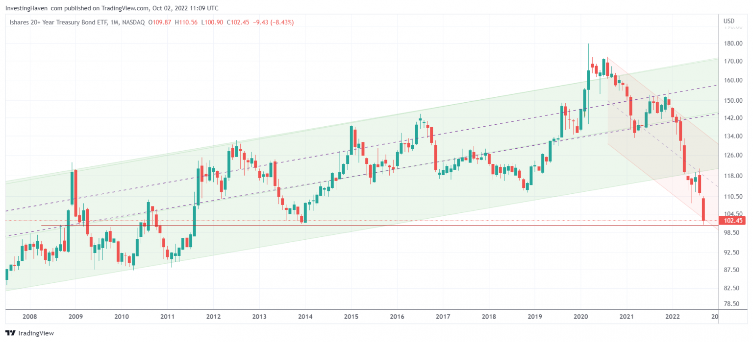 Dugoročni TLT grafikon je nekada bio na 180 poena, ali je tokom 24 meseca pao na 100 poena. Ovo se nikada ranije nije desilo. Iako se ne očekuje da će ići niže, takođe se ne očekuje da će se vratiti na 180 poena. Trezori imaju više potencijala da rastu nego da padnu.