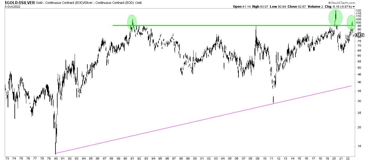 Odnos zlata i srebra je istorijski visok, što sugeriše da je srebro dobra investicija. Zelena linija na donjem grafikonu pokazuje da kad god srebro dostigne odnos od 92:1 u odnosu na cenu zlata, počinje epski preokret. Može proći dosta vremena da srebro postane eksplozivno. U nekim slučajevima to traje godinama, dok u drugim samo nekoliko meseci.